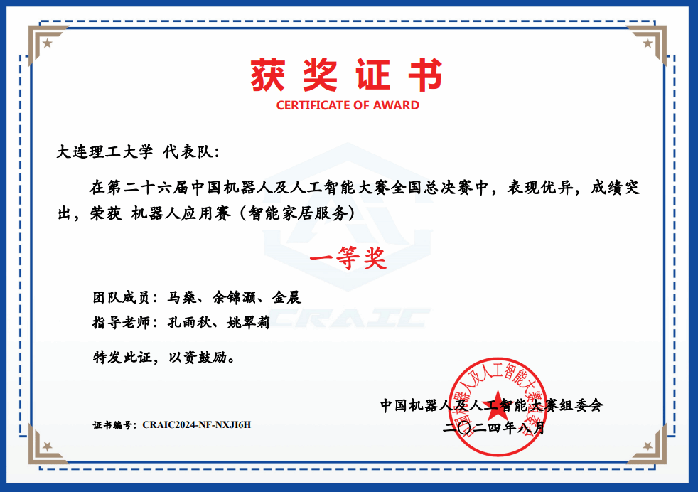 2024年8月19-20日,第二十六届中国机器人及人工智能大赛全国决赛成功举办,学院2022级本科生马燊担任队长的“凌水汪汪队”团队成绩位列一等奖第一位,斩获赛事冠军!