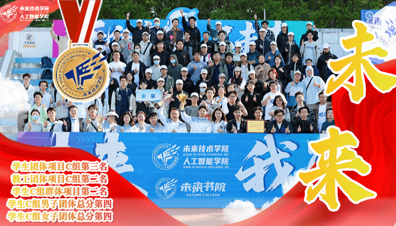 2025 年大连理工大学 “刘长春杯” 田径运动会中,未来技术学院、人工智能学院及未来书院师生凭借开幕式上无人机、机器人、机器狗等科技元素展示的 “交叉融合,共创未来” 理念,在赛场上斩获学生团体项目大拖鞋(大脚板)、集体跳长绳、滚铁环接力、罚点球 4 项冠军及袋鼠跳接力等 4 项亚军,教工团体项目定点投篮、50 米决赛 2 项冠军及 3 项亚军,学生王君辉包揽女子 3000 米、800 米、1500 米 3 项冠军成 “三冠王”,另有多人在跳高、铅球等个人项目中获佳绩,学院还获学生群体项目 C 组总分第二、田径项目 C 组总分第三、男 / 女团体总分第四及精神文明奖,成绩背后离不开运动员训练、教练指导与师生支持,运动会虽落幕,“更快更高更强更团结” 精神将激励师生持续奋进。