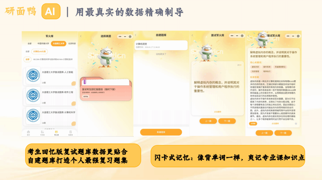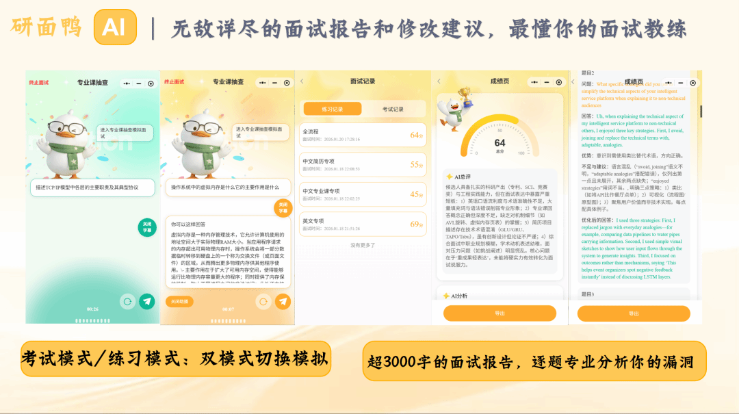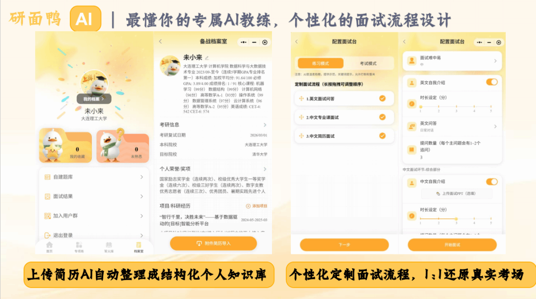 硬核:三大引擎赋能“上岸”:针对传统复试备考中“流程不熟、痛点难练、资料难找”的核心问题,「研面鸭AI」创新构建了全流程模拟、分项突破、知识内化的三维备考体系,为考研学子打造一站式智能备战平台。
