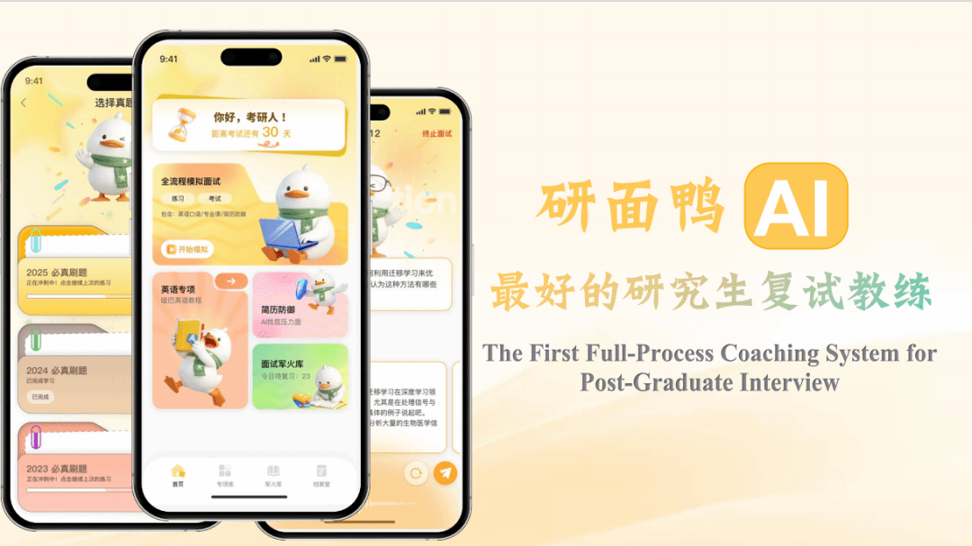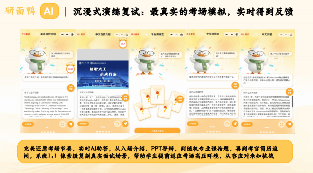 为了打破复试备考中“没人练、不针对、无反馈”的三座大山,大连理工大学未来技术学院“领膺计划”孵化团队历时研发,终于交出了这份答卷——「研面鸭AI」考研复试全流程模拟系统。