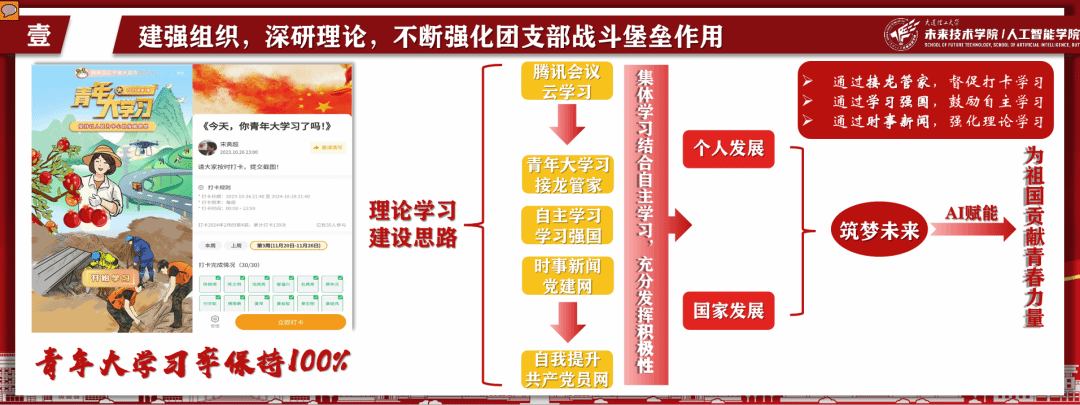 青年大学习学习率始终保持100%,全员递交入党申请书,通过多种途径,他们不断强化理论学习,将个人发展融入国家发展,通过AI赋能,为祖国贡献青春力量。