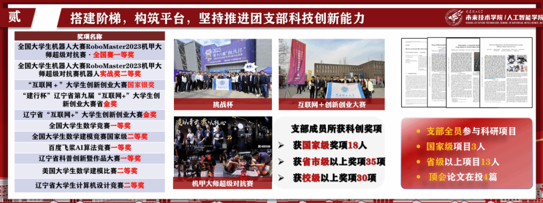 支部全员参与了科研项目,团支部成员取得了一系列瞩目的成绩。累计国家级奖项10余项,省市级奖项30余项,顶会论文再投四篇,展现支部科技创新能力。