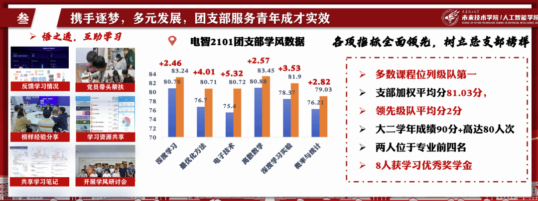 为加强学风建设,他们开展学习互助活动,实行党员带头帮扶和群资料共享的形式。在过去一学年,支部取得加权平均分81.03分的优异成绩,8人获学习优秀奖学金,以上各项均为各支部第一。