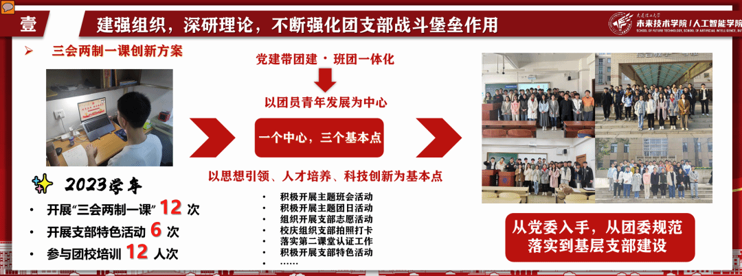 他们围绕一个中心,三个基本点从党委入手,从团委规范,落实到基层支部建设。