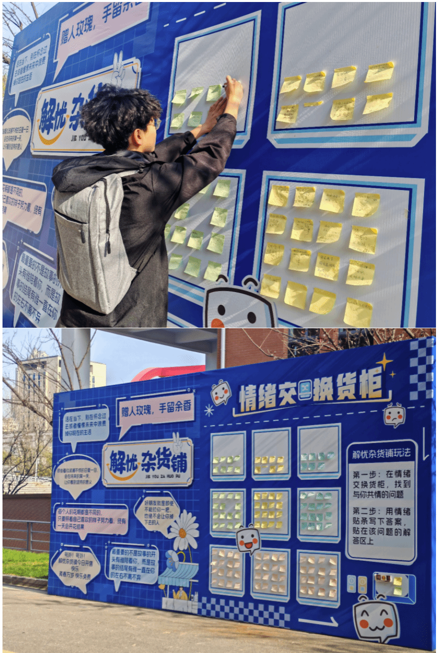 心理文化月期间,阳光心理部在书院楼前放置“解忧杂货铺”,为学子打造心灵港湾。同学们以匿名便签形式倾诉心声,释放压力。这里不仅是倾吐烦恼的空间,也是汲取力量的源泉。