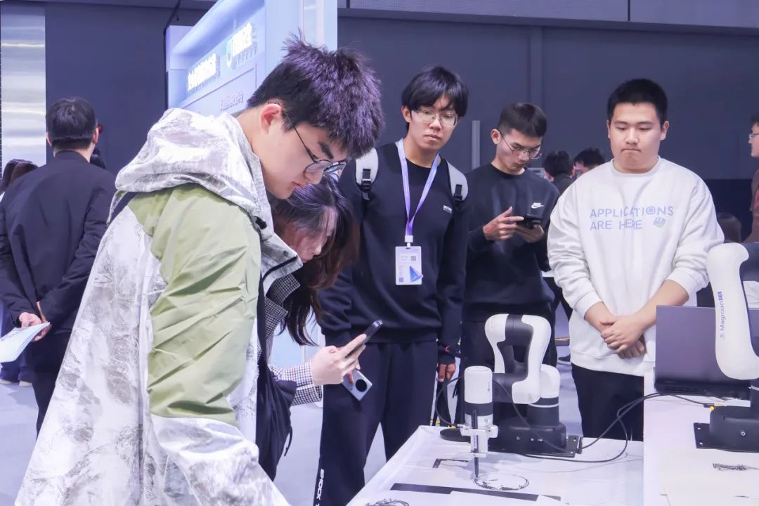 同学们走进5000平方米的AI应用小镇,与100+AI原生应用沉浸式互动。现场展示了多款百度AI原生应用产品、智能产品及生态伙伴品牌。同学们体验了文心一言、文心一格、百度AI健康问答、百度品牌智能体、小度机器人等多种AI设备,并和机器人、机器狗等产品互动。
