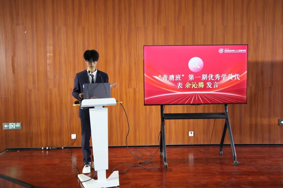 学员代表刘雲,代表“青膺班”全体学员发言。他表示作为 “青膺班”一员,将不负重托,努力学习,为成为一名合格的团学骨干而不懈奋斗。学院党委副书记、未来书院副院长孙智妍为青膺班授旗,激励团体学员牢记这一身份承载的荣誉与责任。