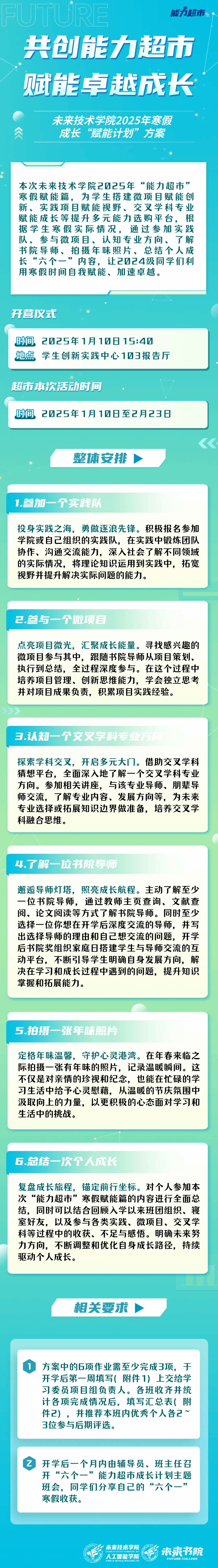 为了激发2024级同学们在寒假期间的自我赋能与卓越发展,未来技术学院推出了“共创能力超市,赋能卓越成长”主题的2025年寒假“赋能计划”。学院通过构建“能力超市”的方式,为学生搭建了专业“微项目”、寒假社会实践、“攀登杯”创新创业项目等多元化能力提升平台,旨在加速同学们的全面发展。