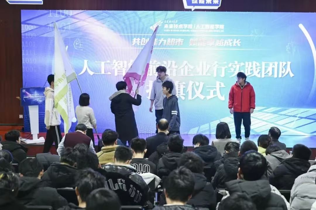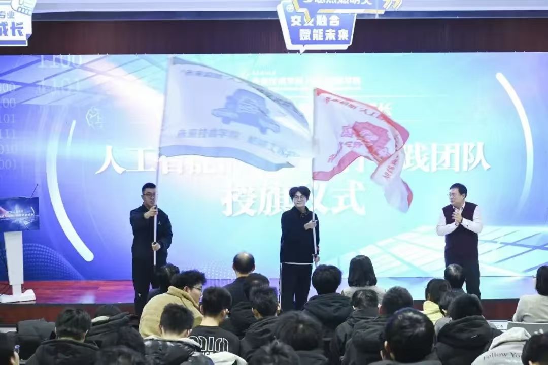 化工学院副院长李琳、生物工程学院副院长袁文杰、机械工程学院副院长马广义、建设工程学院副院长李冬生、未来技术学院副院长江贺为人工智能前沿企业行实践团队授旗。各实践团队代表摇旗鼓劲,用饱满热情开启实践赋能的旅途!