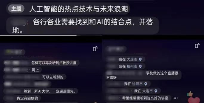 精彩的讲述和生动的案例为师生们提供了认识人工智能技术的全新视角。在直播的云端讨论区,观众们积极讨论互动、热切留言:“各行各业都需要找到和AI的结合点”“学校做的这个直播很不错”“直播课很精彩,能发布回放吗?”……线上线下还有不少观众当即要求“加更”,纷纷表示“希望经常能听到这种紧跟热点讲座”“想继续了解更多人工智能的前沿内容”。