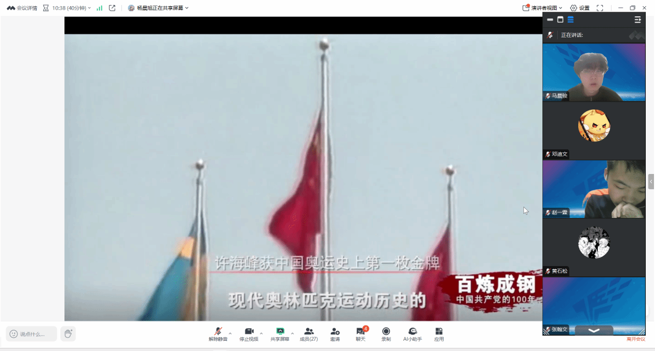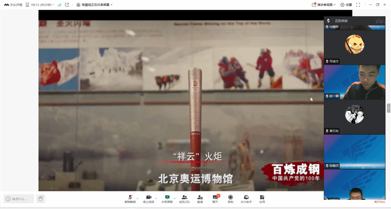 为弘扬奥运精神、增强团员青年的集体荣誉感与奋斗意识,未来2301团支部于2025年2月以“重温奥运荣光,凝聚奋进力量”为主题,通过腾讯会议平台线上开展主题团日活动,组织全体团员观看纪录片《百炼成钢——北京奥运会篇》。