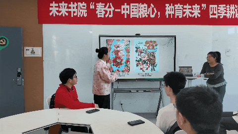 人文学院王玉春老师以一张非遗《春牛图》为引,带领同学们破译农耕文明的“气象暗语”:“春牛图不仅是一幅吉祥年画,更是古人农耕版的气象APP。”牧童(芒神)的鞭长、春牛的毛色、田垄的走向……每一处细节都暗含先民们“观天象、测农时”的玄机。同学们细致观察一幅幅古老画卷,解码传统艺术、气象物候与农耕生产的之间的“神秘算法”,感悟敬畏自然、顺势而为的生态智慧。