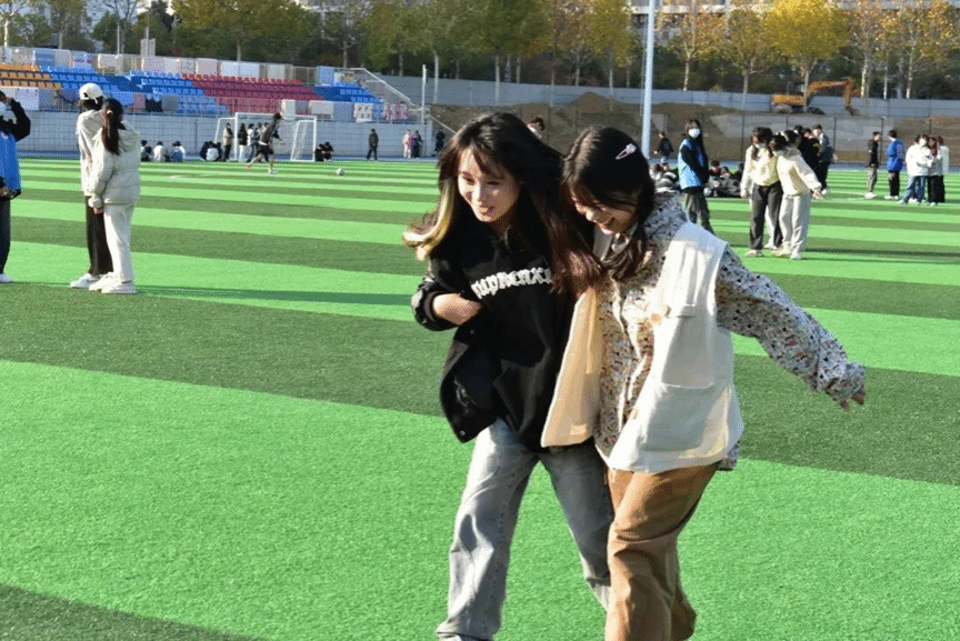 比赛规则:相邻两人其中一只脚绊绑在一起,绑绳的位置不能高于膝盖部分,游戏过程中若绳子脱落,则就地绑好再出发,以完成时间长短进行排名。