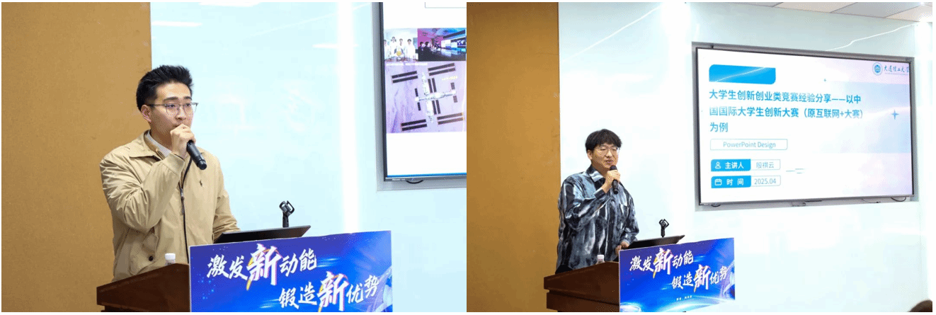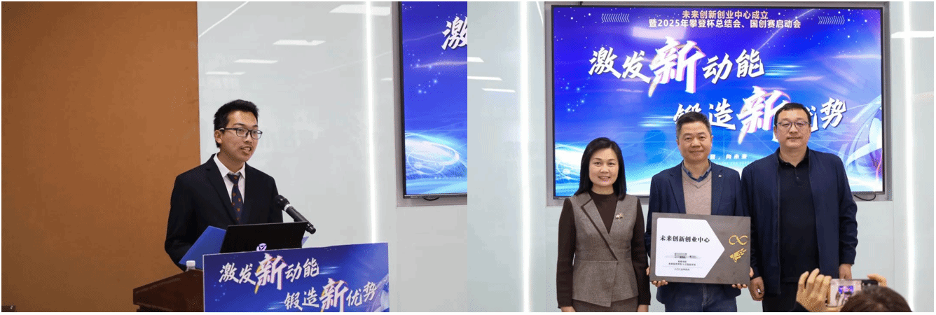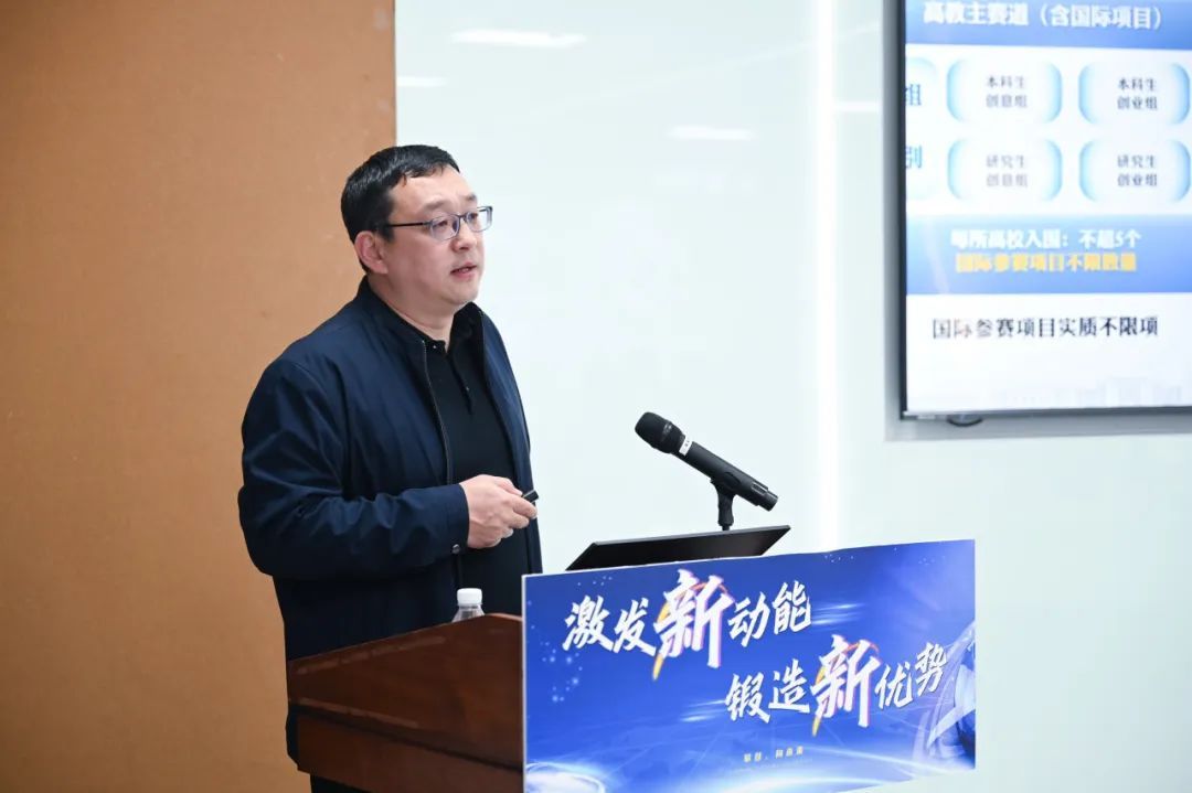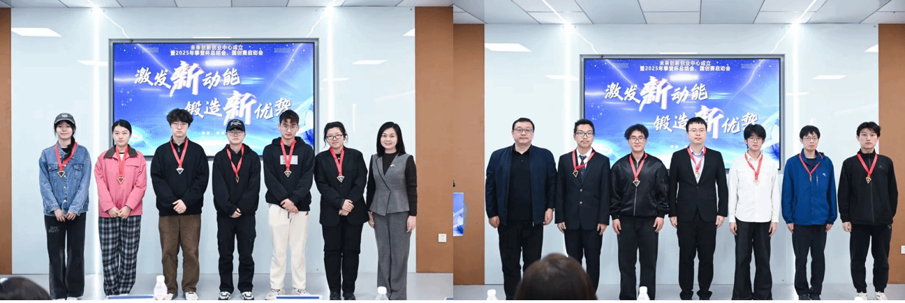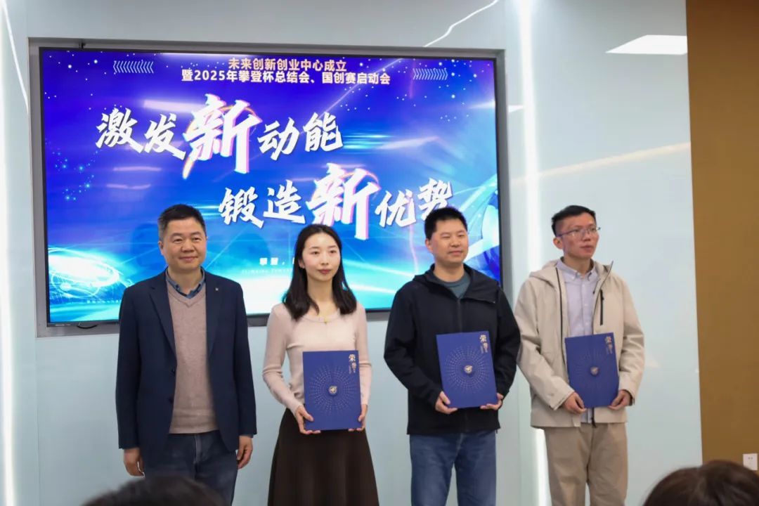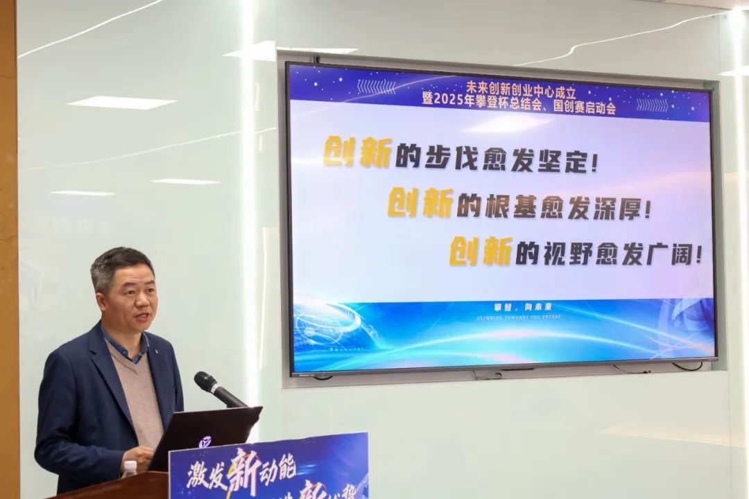 刘新、侯庆敏、江贺共同启动了未来双创中心。在现场,侯庆敏代表未来创新创业中心聘任“领膺计划”双创导师,刘新为师生解读了2025年中国国际大学生创新大赛赛事规则,为国创赛拟参赛团队提供指导,挑战杯和国创赛优秀项目团队负责人夏博涵、殷祺云分别分享了参赛经验。
