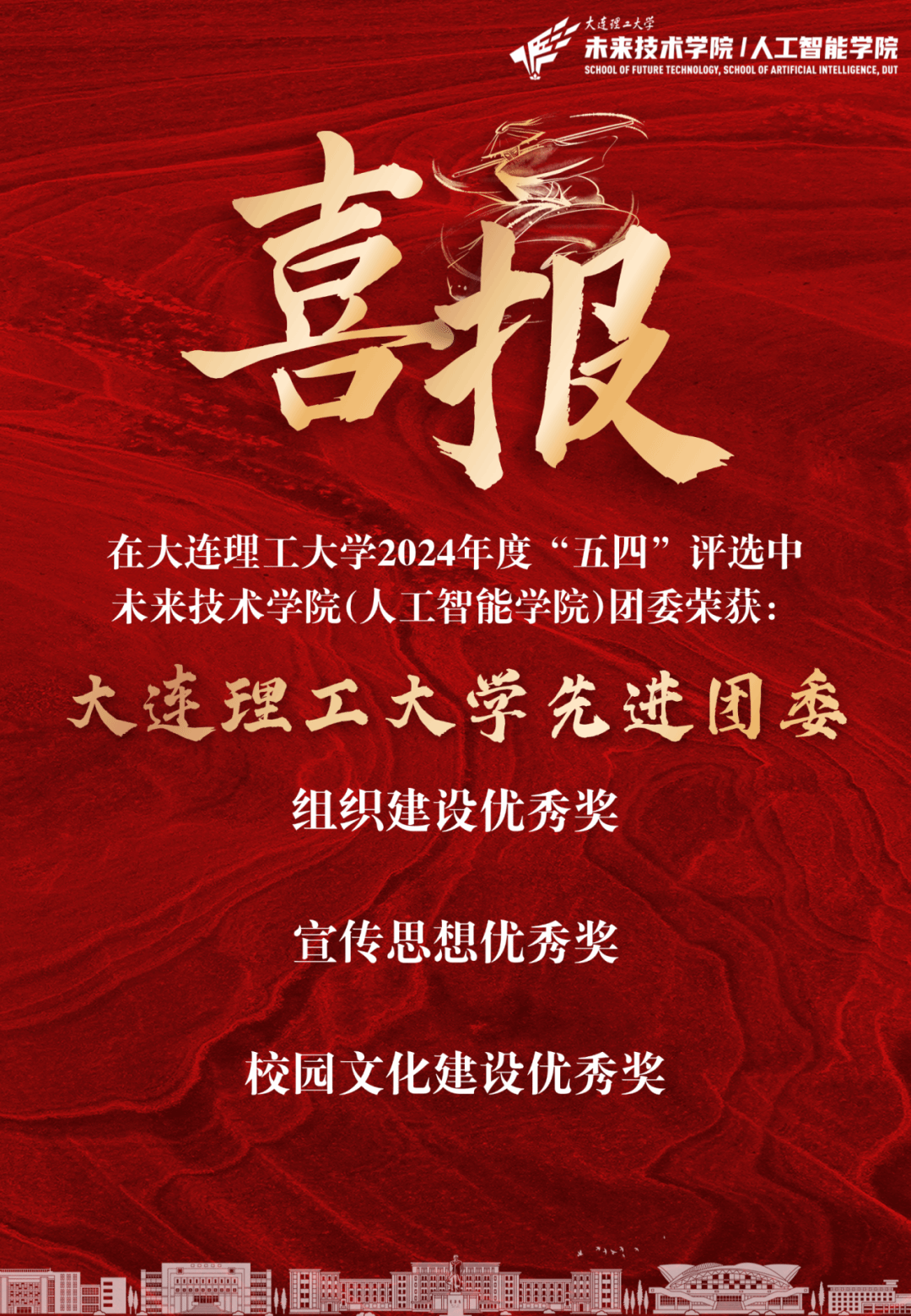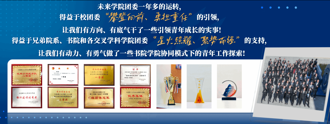 在大连理工大学2024年度“五四”评选中,未来技术学院团委斩获大连理工大学先进团委集体综合奖、组织建设优秀奖、宣传思想优秀奖以及校园文化建设优秀奖三项集体单项奖。