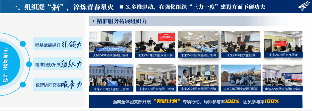 实施“三维攻坚”行动。强基赋能,分层打造“领膺班”“青膺班”基层分团校,配置“AI+”成长菜单,覆盖青年280人;精准服务,面前全体团支部开展“赋能计划”专项行动,导师参与率100%、团员参与率100%。数智协同,开发动态监测系统。规范召开团代会、学代会,收集提案61件并截至目前落实超50%。
