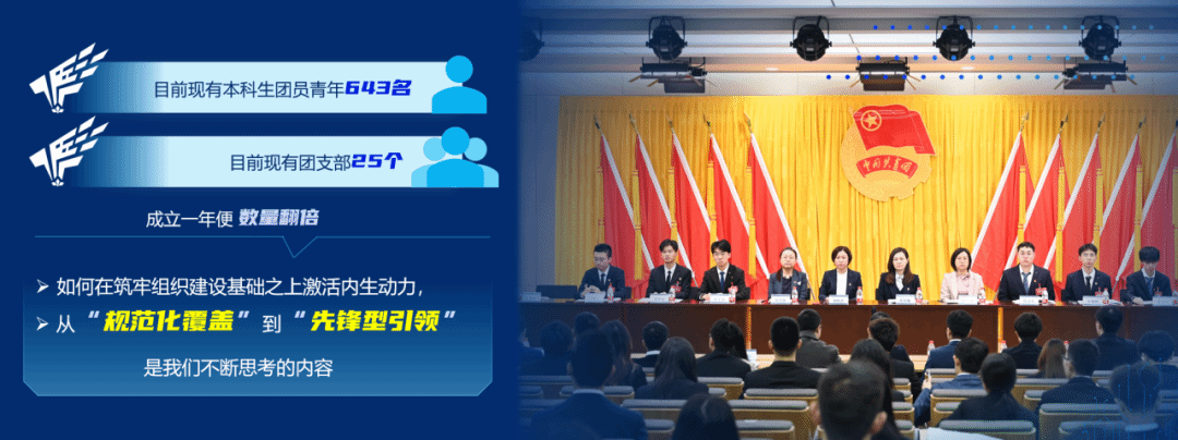 学院目前现有本科生团员青年643名,团支部25个,成立一年,数量翻倍,学院实现在筑牢组织建设基础之上激活内生动力,从“规范化覆盖”到“先锋型引领”。