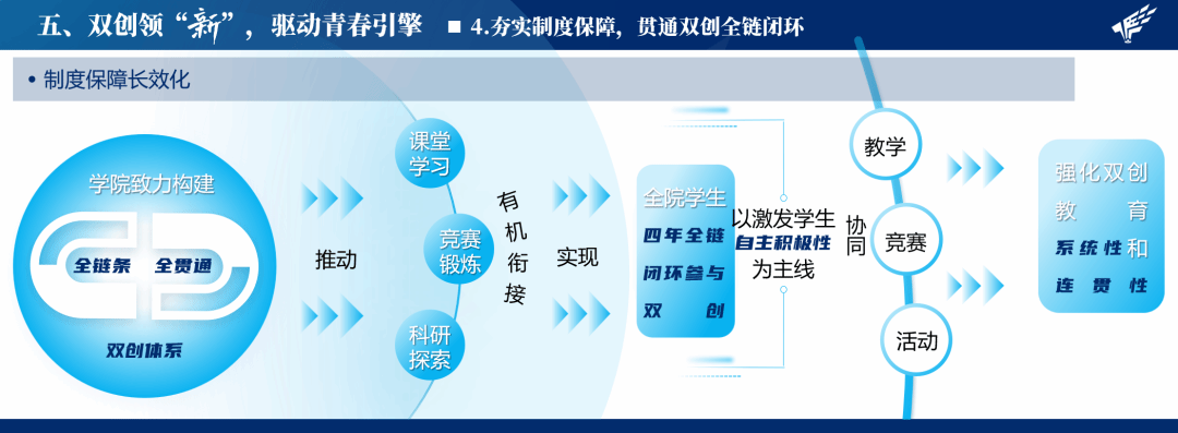 制度保障长效化,构建学院双创体系,协同教学、竞赛、活动三大板块,强化系统性和连贯性;