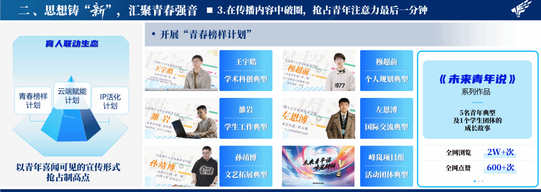 以“育人联动”为生态,通过建立“三大计划”宣传主线,开展“青春榜样计划”,推出《未来青年说》系列作品,生动刻画5名青年典型和1个团队在科研、艺术等