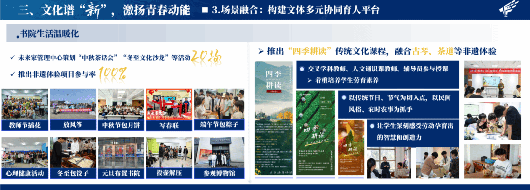 书院生活温暖化,策划“中秋茶话会”“冬至沙龙”等书院暖心活动20场;推出“四季耕读”传统文化课程,融合古琴、茶道等非遗体验;