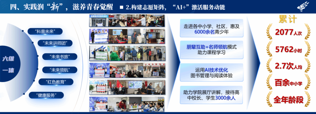 立足人工智能学科特点,组建六大特色志愿服务队。累计吸引2077人次参与,服务时长5762小时,人均参与2.7次。