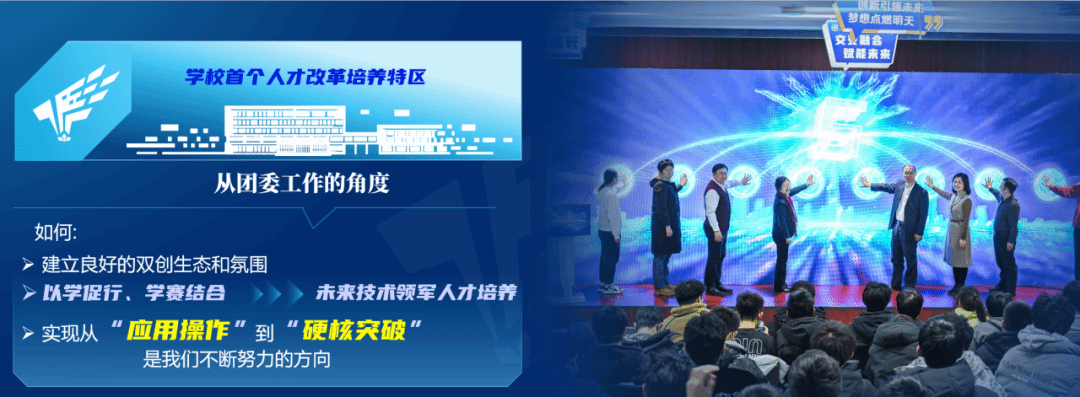学院以创新为基本方向,作为学校首个人才改革培养特区,从团委工作的角度,如何建立良好的双创生态和氛围,以学促行、学赛结合,激发未来技术领军人才培养,实现从“应用操作”到“硬核突破”。