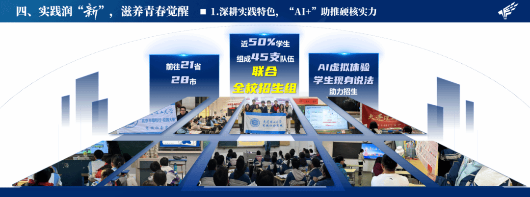 联合交叉学科学院,寒暑假组建“人工智能前沿企业行专项实践队”,联合全校各省市招生组,近一半学生组建45支母校行宣讲团奔赴全国重点中学,联合交叉学科