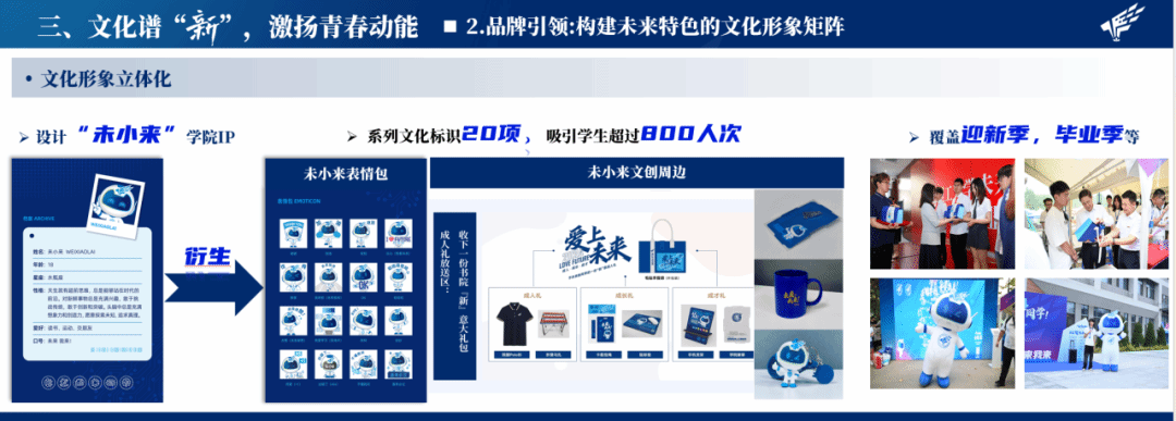 文化形象立体化,设计“未小来”学院IP,制作系列文化标识20项,开发表情包、文创周边等衍生品数十款;