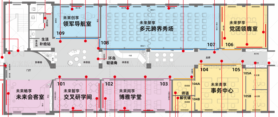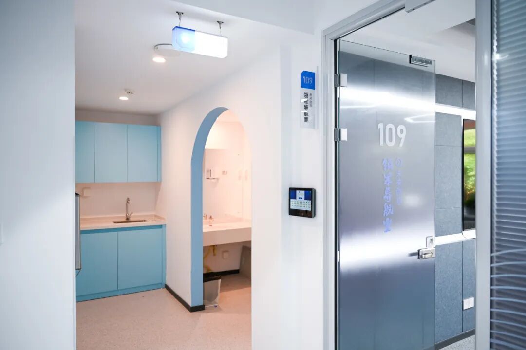 这里提供茶水、应急物品,满足师生基础需求;在二楼和七楼设有未来影音室和24 小时自习室,全天候开放。