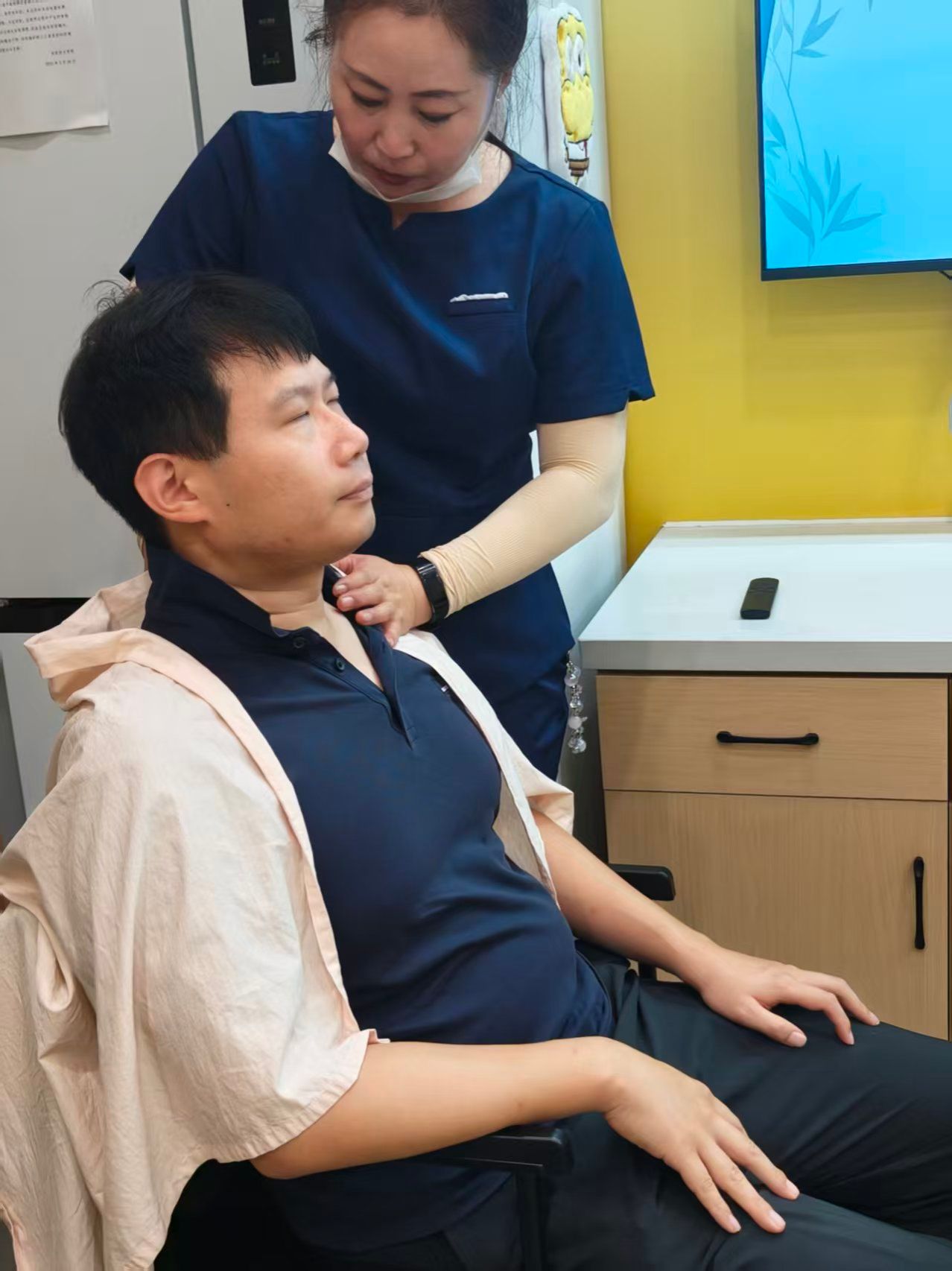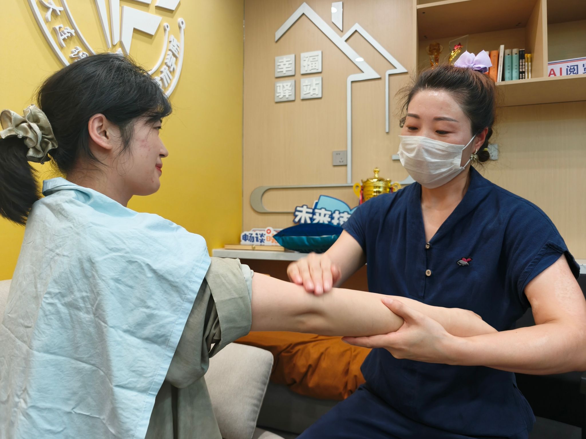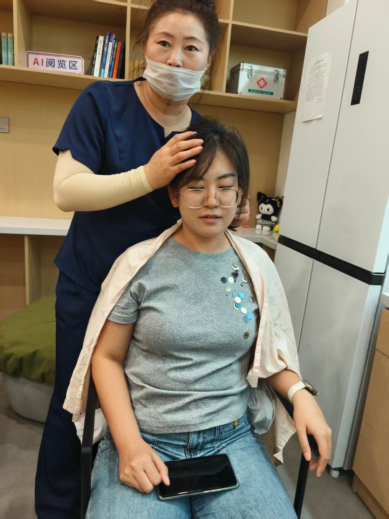 最受期待的经络导养环节紧随其后。根据报名顺序,教职工们分组依次体验,医师专注地为每位教职工进行头肩颈肌骨舒缓,精准点按风池穴、肩井穴,轻柔推拿紧张的斜方肌,专业的手法让紧绷的肌肉逐渐放松。“调理完之后脖子舒服多了,之前总觉得僵硬,现在轻松不少!” 刚体验完的宋老师动了动脖子,还兴奋地和等候的同事分享感受。调理过程中,医师还不忘传授自我舒缓技巧,“平时没事可以用指腹轻揉颈肩穴位,力度以感到酸胀为宜”,教职工们一边听一边跟着模仿,还互相提醒,驿站内始终充满轻松愉悦的氛围。
