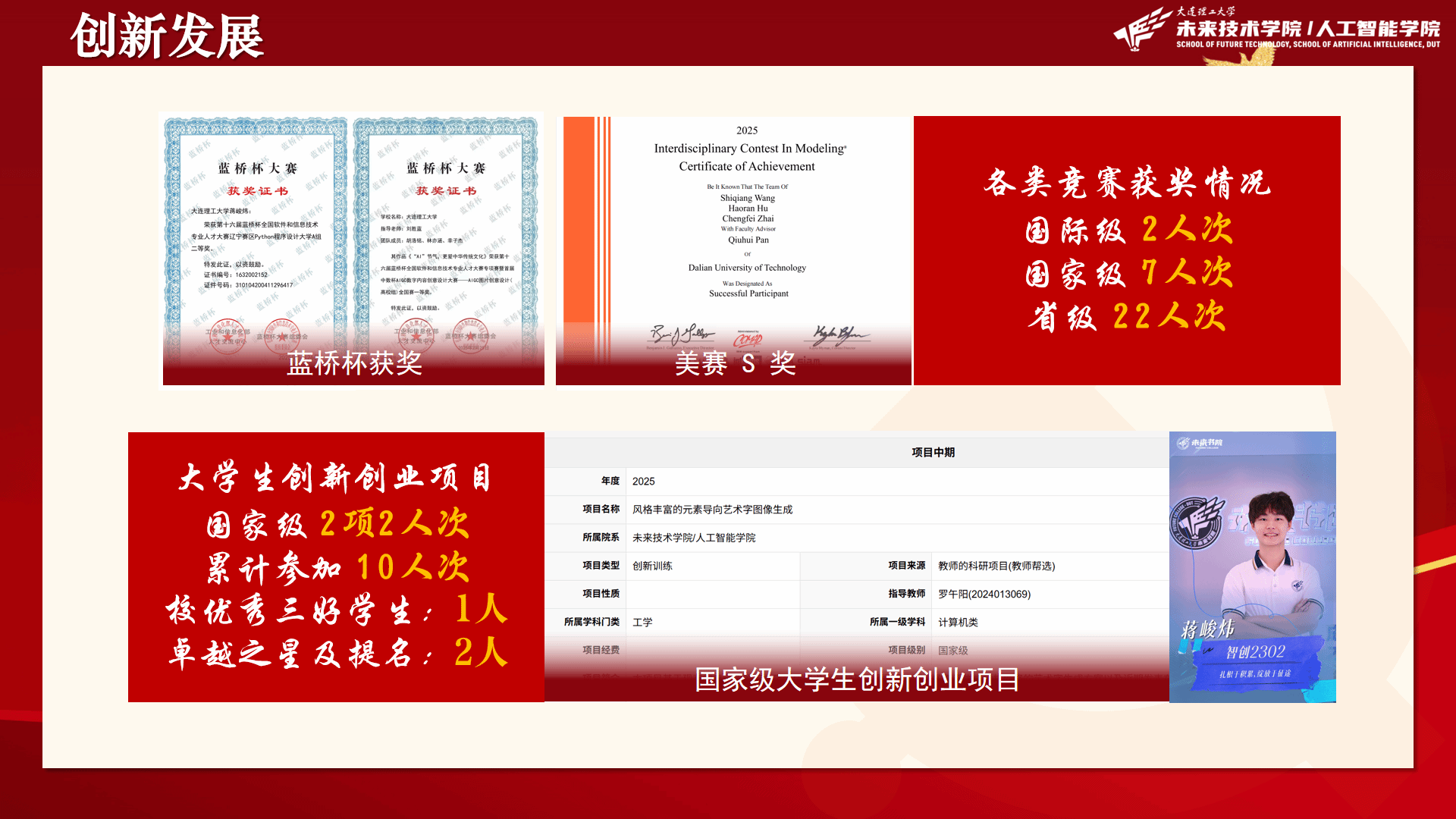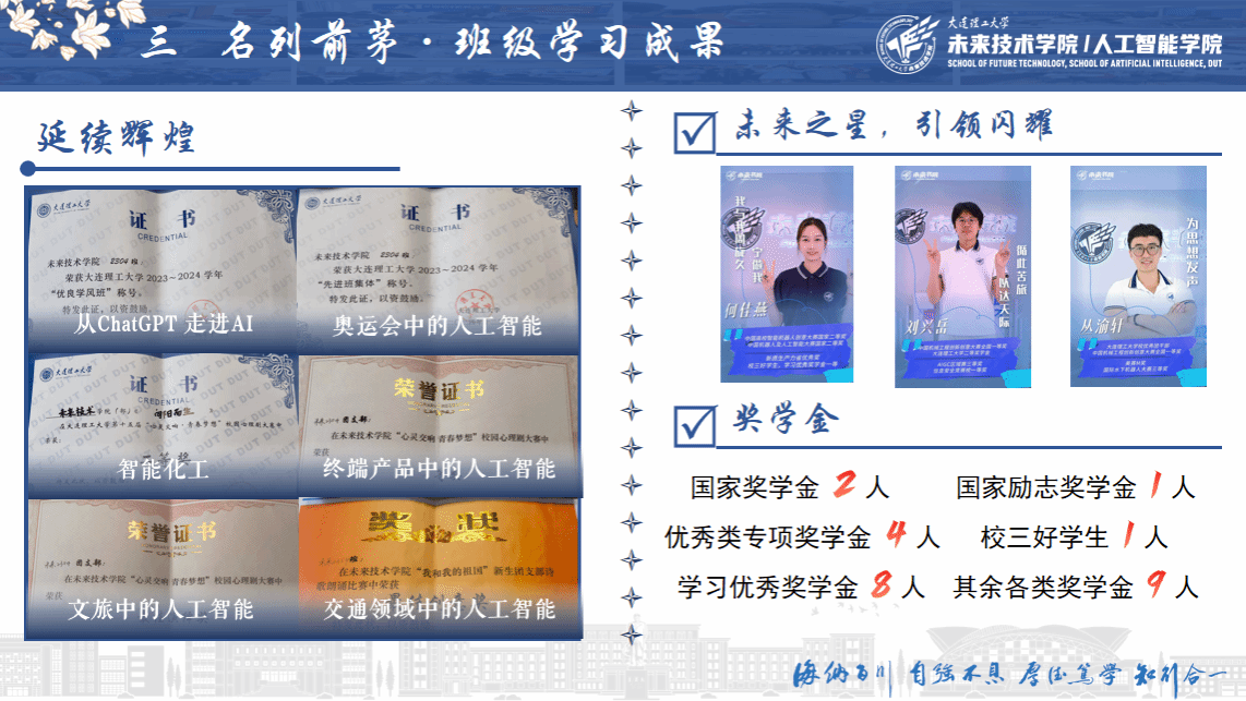 未来2304班学业和科技创新成果亮眼,包揽人工智能专业前五(加权最高分近95),各专业前五共8人,占所有专业前五总数的1/3,奖学金获奖25人次,2人获得国家奖学金,何佳燕等3位同学获 “未来之星” 提名。科创方面,12人次参与双创项目,获30余项科创奖项,其中国际级奖项2人次、国家级奖项9人次,2名同学在智能生工相关领域发表核心期刊论文。