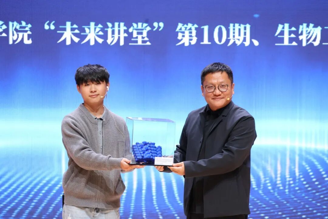 讲座最后,未来技术学院同学们将“生工有未来”这段文字用氨基酸编码成蛋白质,经AlphaFold预测其空间结构后,以聚乳酸材料打印出来,现场赠送给尹烨校友,以此表达对生命科学前沿的向往与对未来美好的诚挚祝愿。