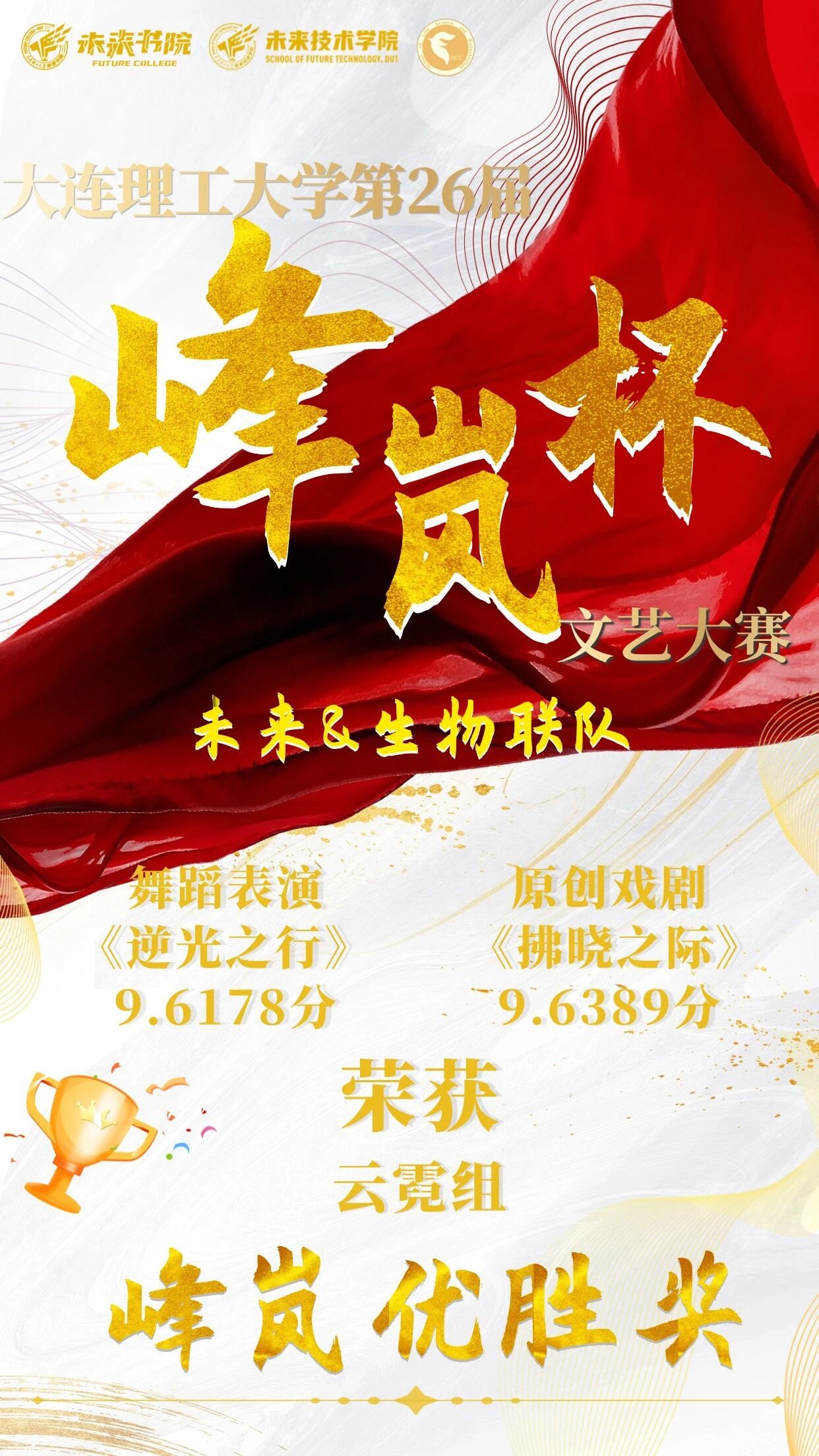 第二十六届“峰岚杯”决赛圆满落幕。未来技术学院与生物工程学院联队在赛事中表现卓越,原创戏剧《拂晓之际》以深刻的科幻叙事与人性思考荣获9.6389分,舞蹈表演《逆光之行》以充满力量与美感的肢体语言斩获9.6178分,荣获云霓组峰岚优胜奖。
