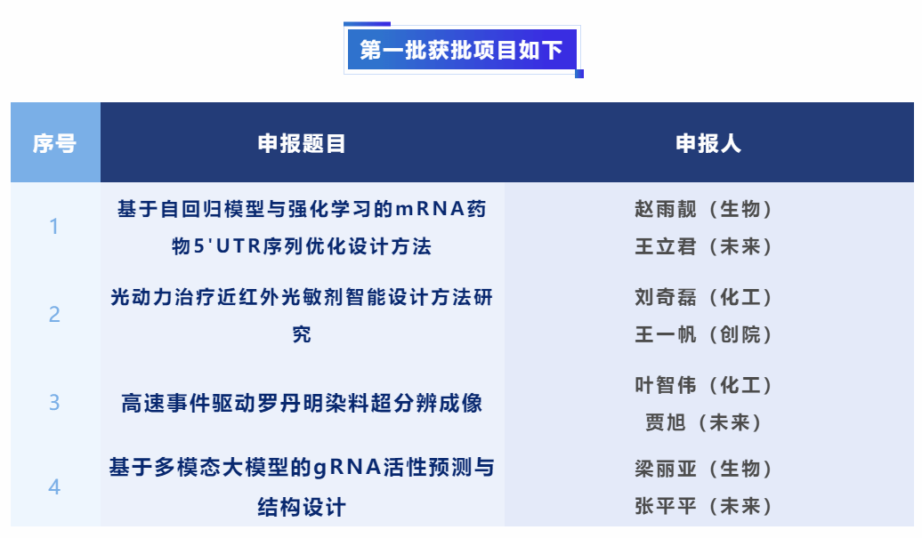AI4S交叉研究基金由未来技术学院发起,联合各交叉学科专业学院共同设立。研究项目团队由未来技术学院人工智能双聘教师和各交叉学科专业教师结对子组成,共同挖掘AI4S在各学科领域的研究潜力。立项获批的项目团队组合将获得20万元由未来技术学院和交叉学科学院联合资助的科研基金,用以支持发表具有创新性和高质量水平的研究成果。