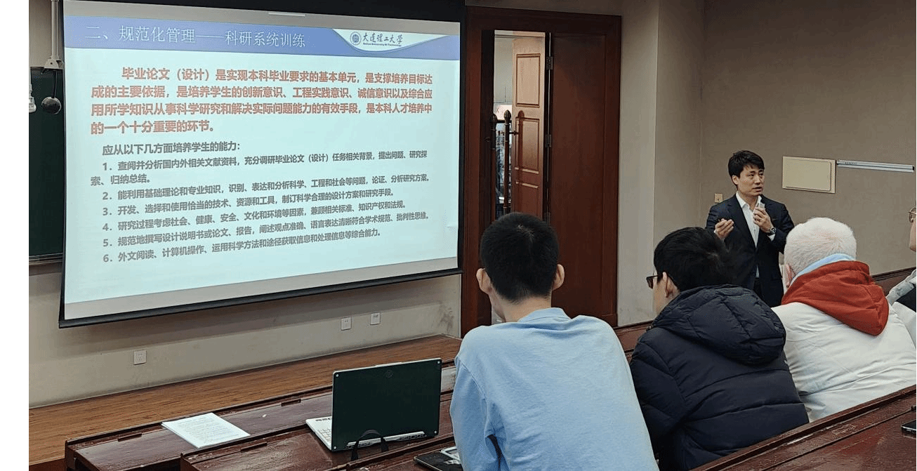 会上,郭艳卿老师阐释了毕业论文的重要意义,强调其是本科科研素质训练的核心,是理论与实践衔接的关键。学院选派专任青年骨干教师和双聘主干教师组成指导团队,为学生提供线上线下全方位指导。同时为同学们提供了毕业论文规划清单,包括撰写期间的各环节要素。动员大会着重强调了论文内容的原创性与理论性、论文格式的标准与要求,提高了学生对本科毕业论文的重视程度,激发了大家对科研创新的敬畏感与责任感。