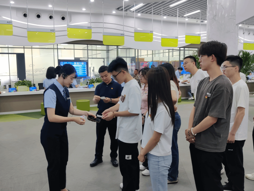 (适逢人流稀疏,讲解员为支部党员取号,体验办事流程)