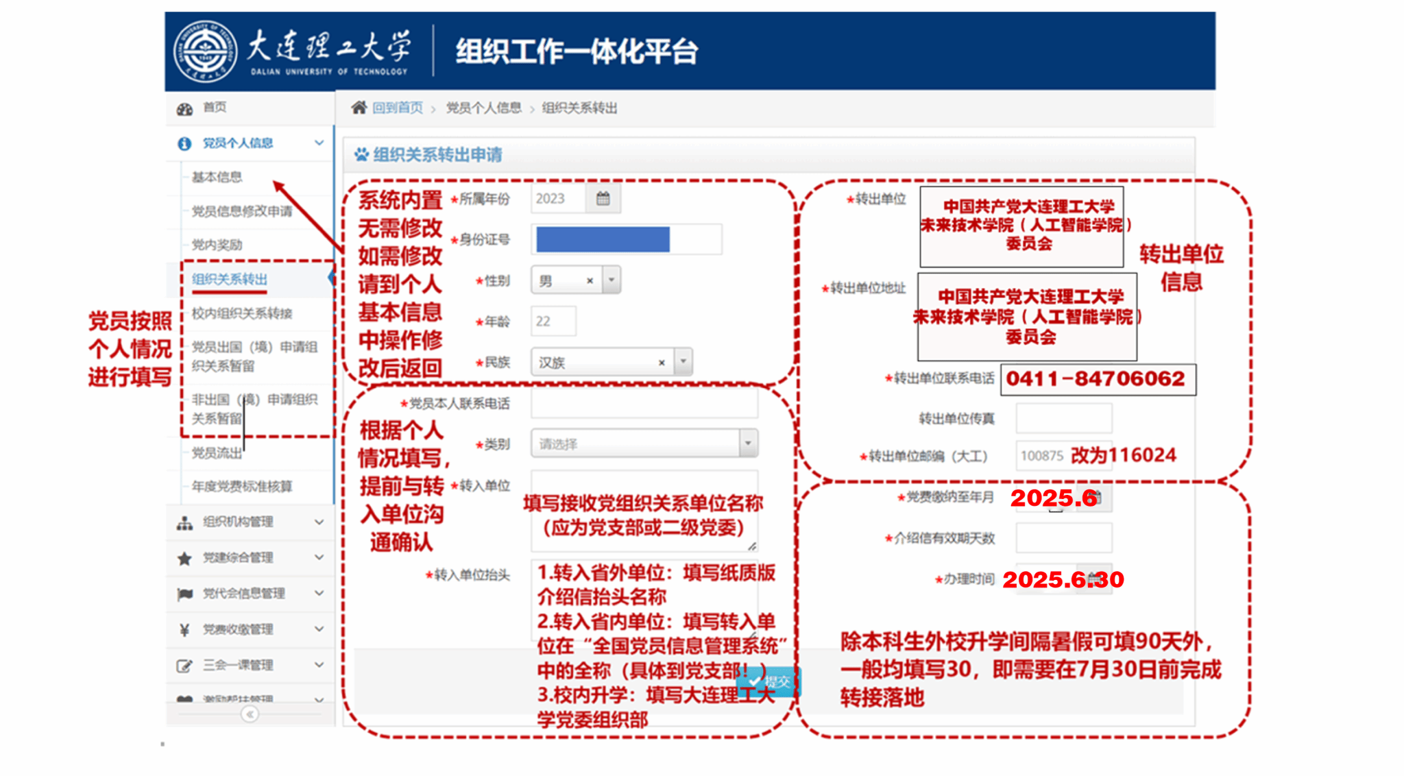 ②登录学校组工一体化平台https://zzgz.dlut.edu.cn提交转出申请(“党员个人信息”-“组织关系转出”),需在6月5日前完成。具体操作如图所示:
