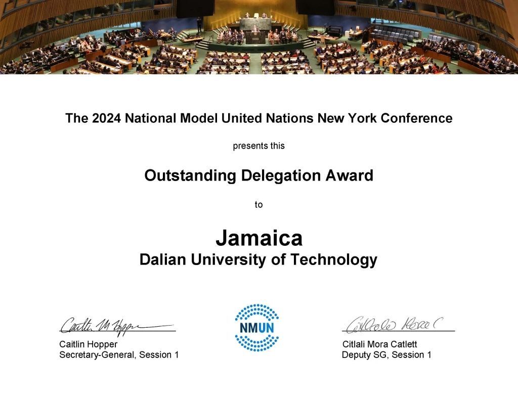 本次纽约全美模拟联合国大会于3月24至28日在纽约举办,共吸引来自107个国家、共计331个代表团的5000余名大学生参赛。大会设专门评审团根据各代表团参与委员会的表现、贡献及成果等综合评选出获奖团队经大会组委会指定此次我校代表团代表牙买加参会。