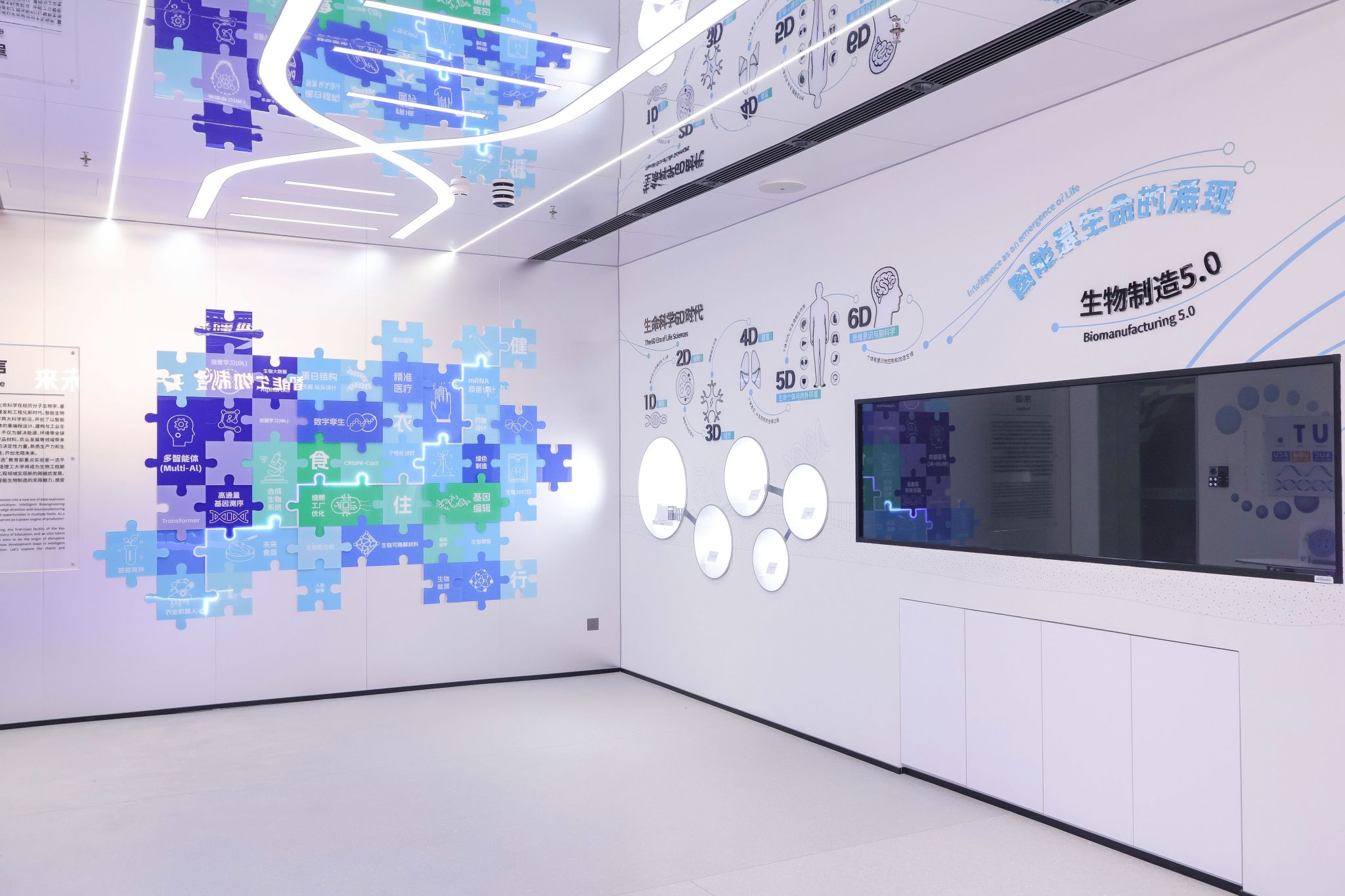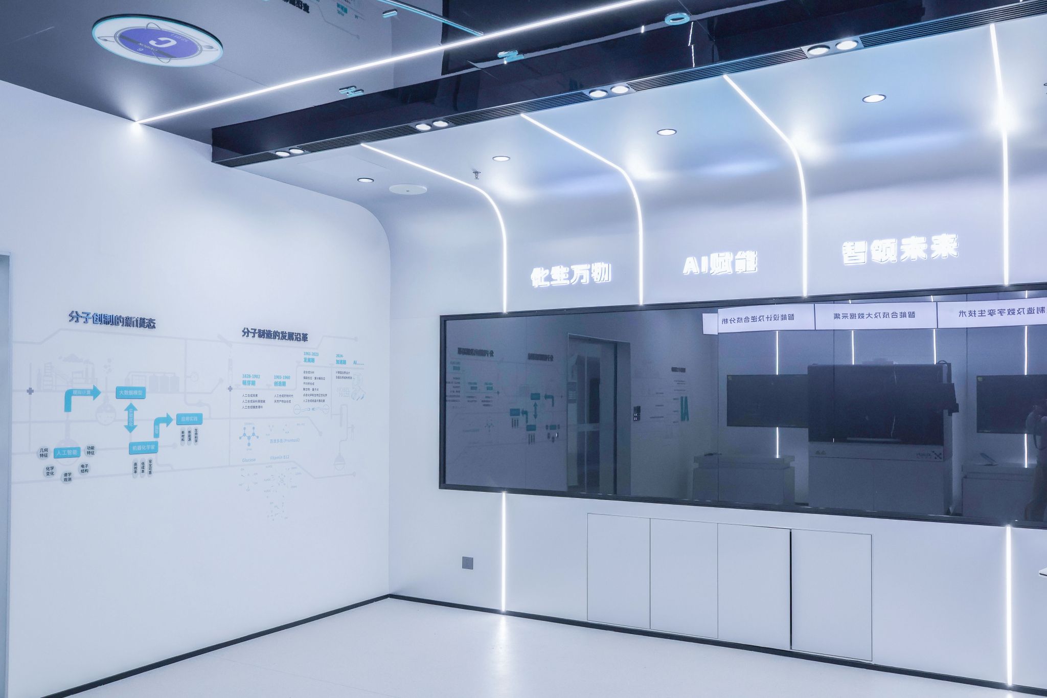 智能分子工程场域,学生可以借助人工智能的强大算力,根据具体的应用需求或行业痛点,精准地进行分子设计与逆合成分析,并可以通过智能算法,快速呈现复杂的分子结构与合成路径。基于源于真实产业需求的微项目,学生可以通过“AI分子设计-高通量测试-数据智能分析”反复迭代优化,最终筛选出性能最优的分子结构。 | 智能生物工程场域,学生可以利用VR技术将抽象的生物学知识,“进入”细胞内部进行交互探索和认知,DNA复制、蛋白质折叠、细胞器功能、基因组测序变得触手可及。此外,学生可以在智能生物工程垂直大模型的帮助下,基于真实科研需求的微项目进行项目式学习,在集成环境中进行编码实践、数据分析,并使用AI蛋白质结构预测工具将抽象序列具象化。 |