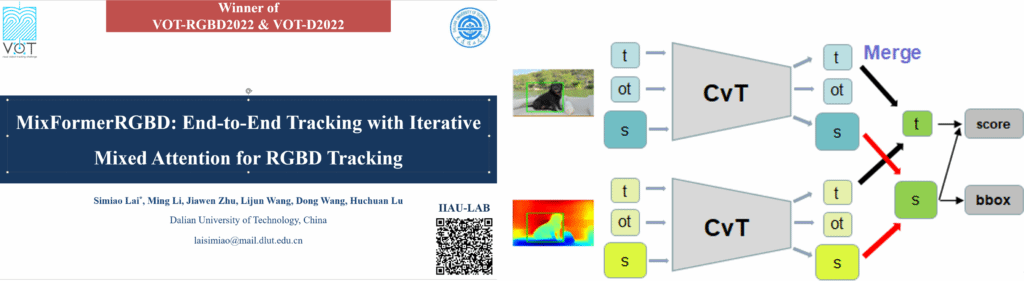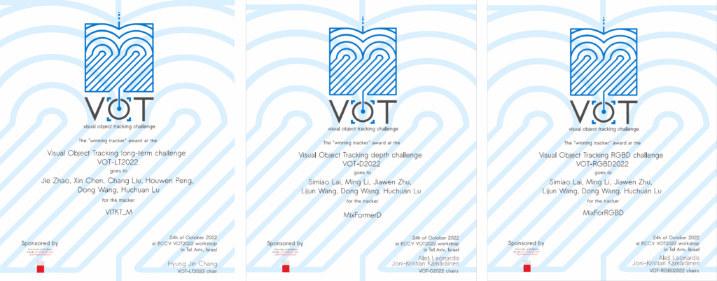 近日,国际视觉跟踪竞赛Visual Object Tracking Challenge 2022 (VOT2022) 在ECCV2022(欧洲计算机视觉国际会议)期间举行了颁奖仪式和比赛总结。大连理工大学电子信息与电气工程学部卢湖川教授带领的IIAU实验室分别在长时、深度及RGBD三个赛道获得冠军。自2018年起,IIAU实验室已连续五年在该国际竞赛的多个赛道中夺冠。本次长时赛道的冠军算法VITKT_M由博士生赵洁、陈鑫和刘畅共同合作完成,指导老师是卢湖川教授、王栋教授和彭厚文老师。深度赛道和RGBD赛道的冠军算法MixFormerD/MixFormerRGBD由博士生赖思邈、硕士生李明和博士生祝嘉文共同合作完成,指导老师为卢湖川教授、王立君副教授和王栋教授。第一作者赵洁、赖思邈分别应邀在颁奖仪式上作远程大会报告,向与会代表介绍各自获奖算法的核心内容。