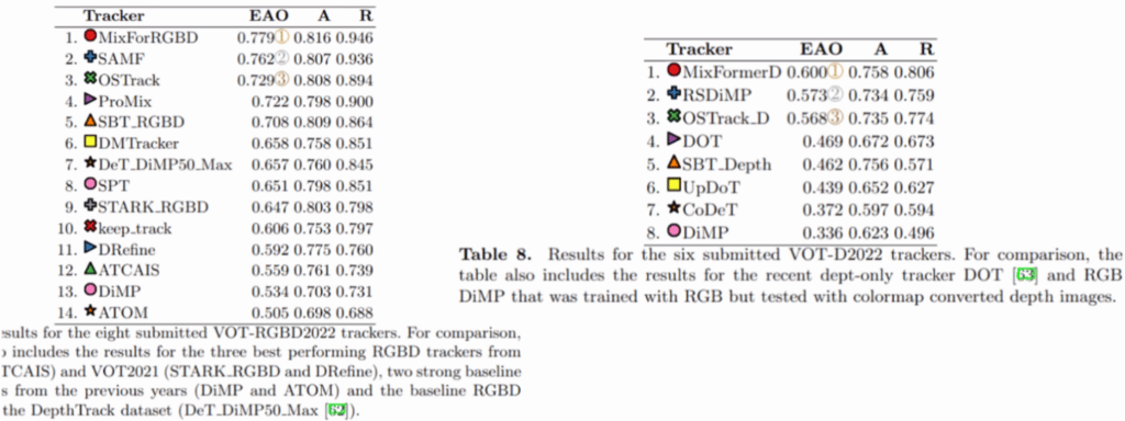 类似地,对于深度跟踪赛道,由于只有深度图可以利用,团队取代了MixFormerRGBD的RGB输入而换成归一化之后的深度图进行微调,并提出了跟踪漂移惩罚策略,以针对跟踪过程中不可信的位移突变情况进行惩罚,最终在深度和RGBD赛道上取得了大幅领先的成绩。如下图所示,在VOT-RGBD2022赛道上我们领先第二名1.7个百分点,在VOT-D2022赛道上我们领先第二名2.7个百分点。